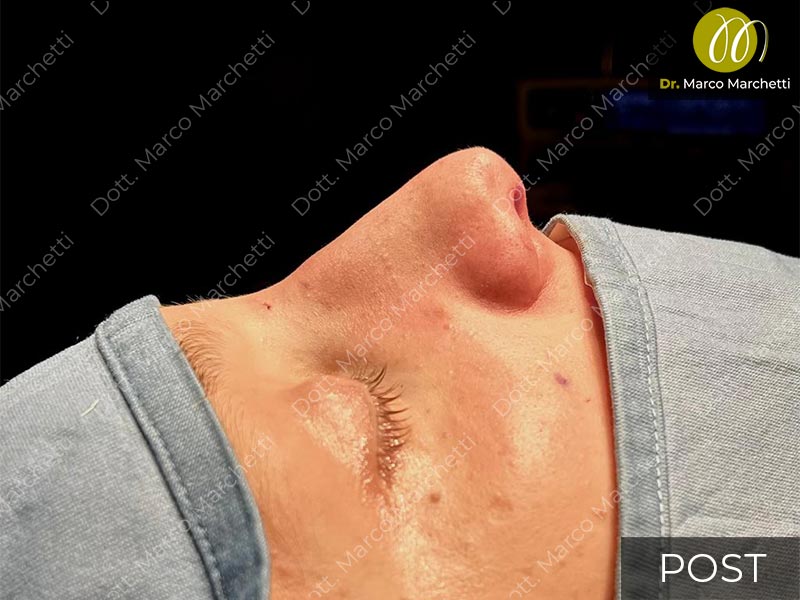In questo caso la paziente aveva in mente di avere un naso più aggraziato e ha fatto delle richieste specifiche su alcune subunità del naso operato con tecnica chiusa trattandosi di un naso primario