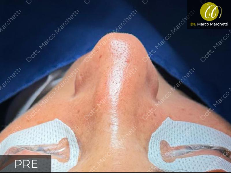 Signora adulta con cute spessa e dorso molto largo; riproporzionare considerando il naso di partenza. L’effetto è potentissimo senza praticare enormi resezioni.